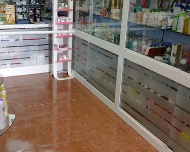 Vinilo sobre Cristal , Farmacia J Martin, Agaete, Gran canaria. |
